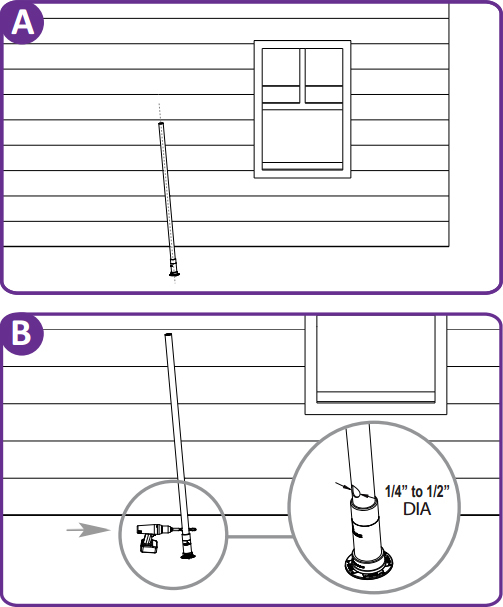 Drill a 1/4″ to 1/2″ diameter hole directly through the pipe about 7″ up from the ground.
